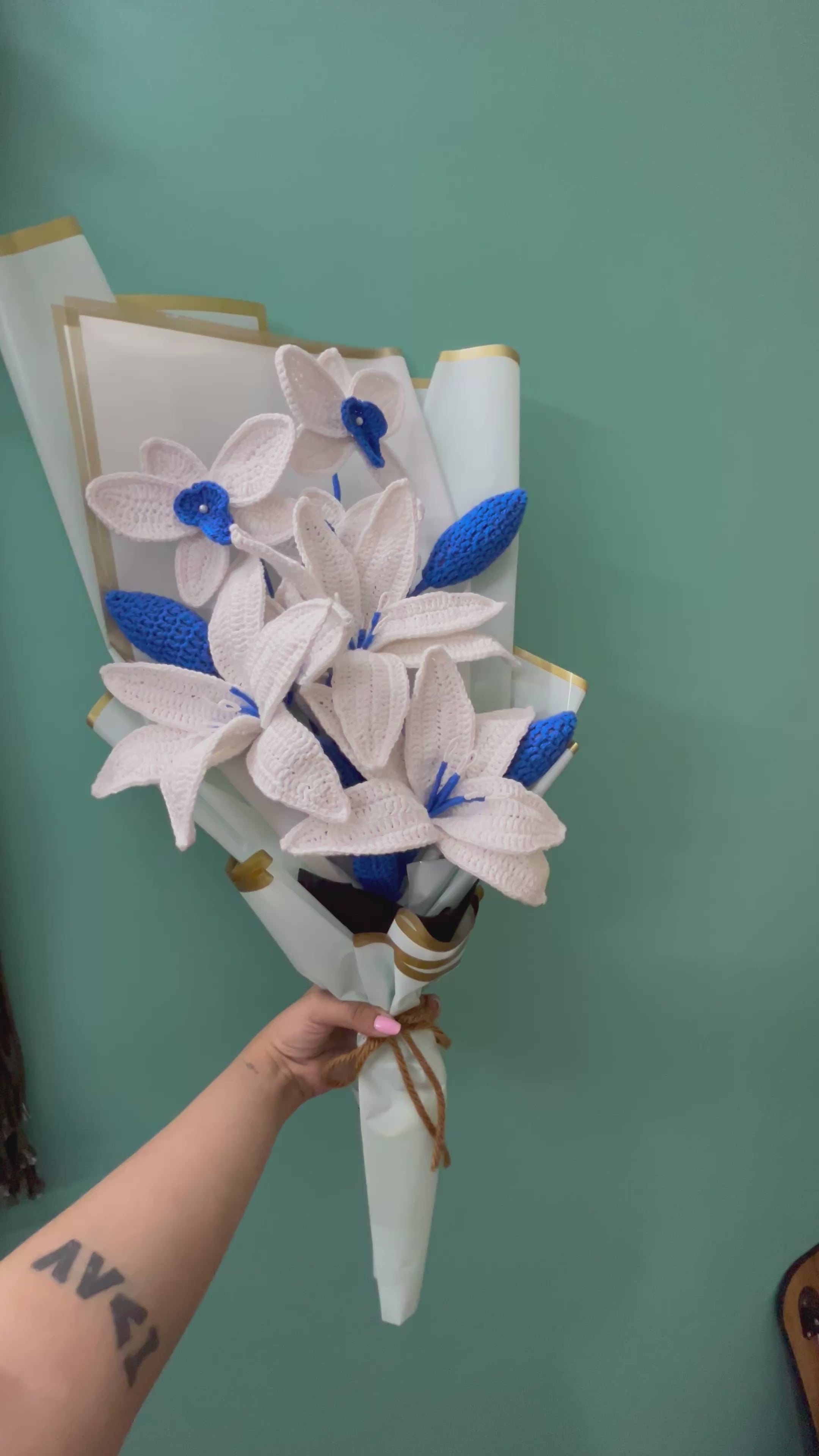 Add a touch of quirk to your special occasion with our Midnight Snow Lillies bouquet. Hand-crocheted with premium cotton yarn, it features 3 lillies in full bloom, along with 2 orchid sticks. Don't settle for ordinary when you can have a unique and luxurious centerpiece.